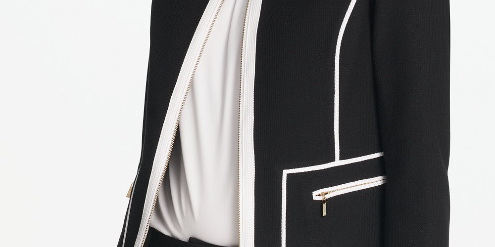 Comprimento aproximado: 21" | Sem gola; fecho de zíper frontal | Ombreiras; acabamento debruado em toda a peça | Dois bolsos com zíper na frente | Sem forro | Poliéster/rayon/elastano; forro: poliéster