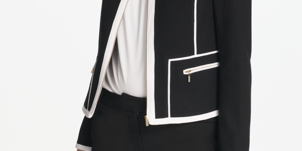 Comprimento aproximado: 21" | Sem gola; fecho de zíper frontal | Ombreiras; acabamento debruado em toda a peça | Dois bolsos com zíper na frente | Sem forro