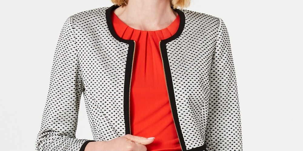 Comprimento aproximado: 21" | Sem gola; fecho de zíper frontal | Acabamento debruado em toda a peça; ombreiras; bainha peplum | Abas nos bolsos | Forrado