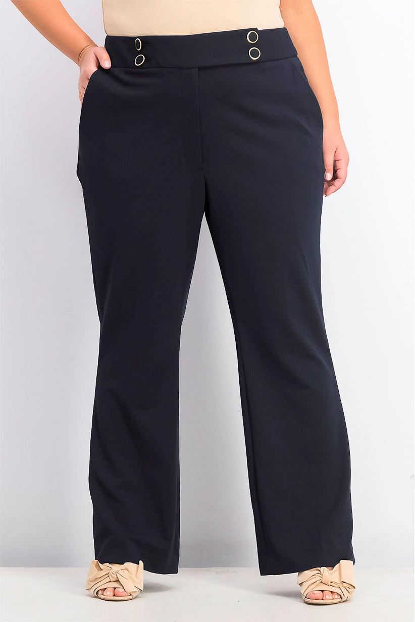 Comprimento interno aproximado: 32" | Cintura alta; ajuste reto nos quadris e coxas; perna reta | Fecho de zíper na frente | Botões decorativos na cintura | Dois bolsos nos quadris | Poliéster/elastano