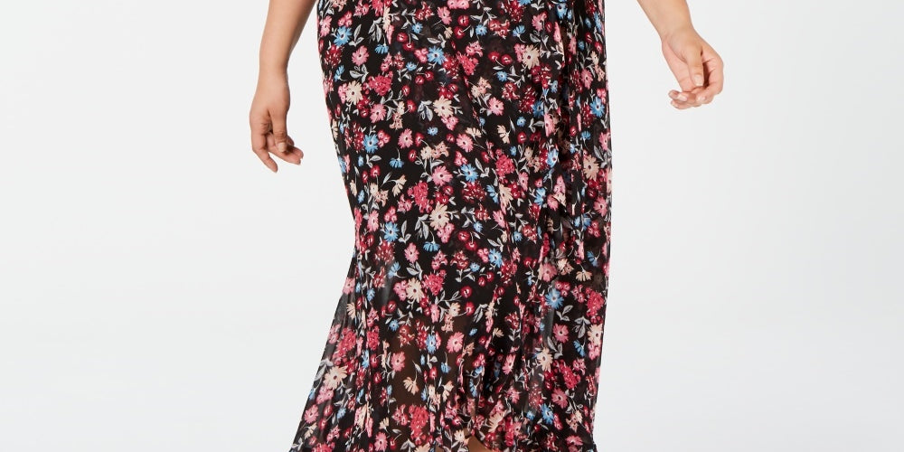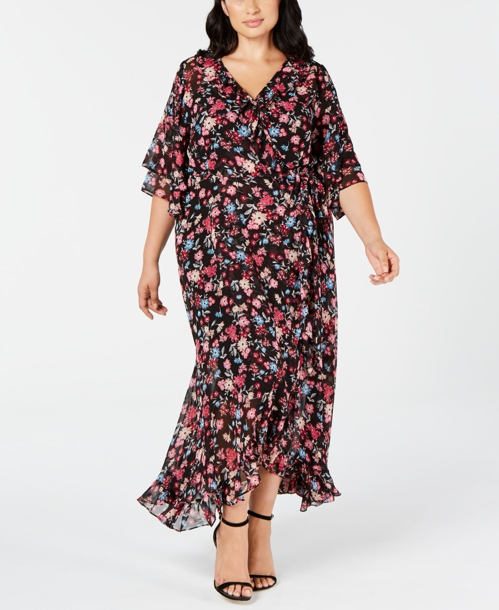 Aproximadamente 124 cm de comprimento, do centro do pescoço até a bainha. O comprimento é baseado no tamanho 48W e varia 6 mm entre os tamanhos. | Decote em V; Silhueta longa | Fecho de zíper oculto nas costas | Mangas bufantes | Modelagem envelope falso com amarração na cintura.