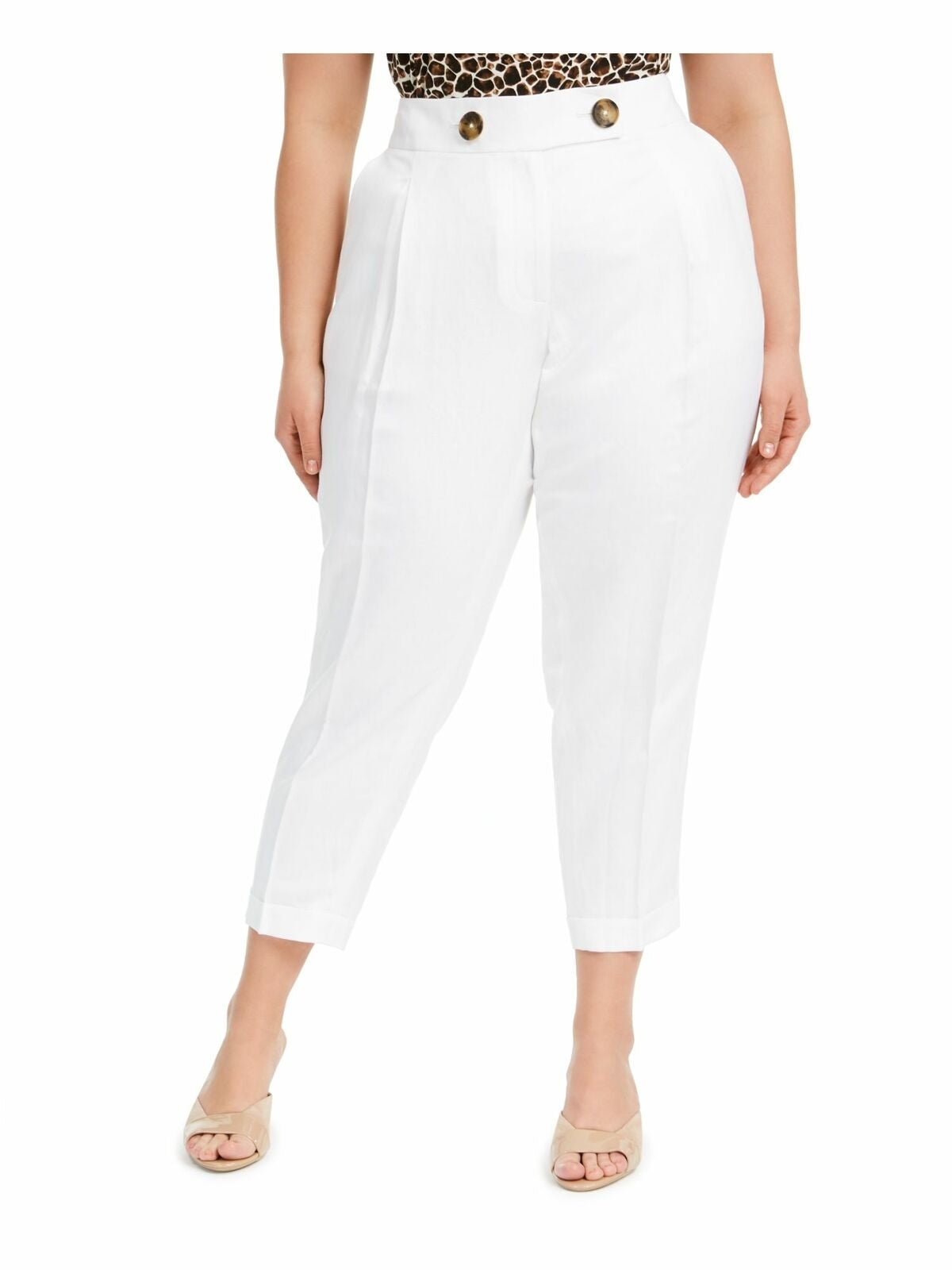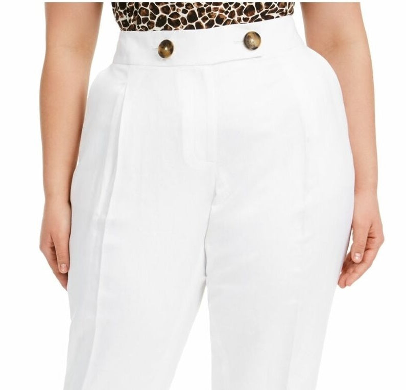 Comprimento interno aproximado: 28" | Cós médio; corte justo nos quadris e coxas; bainha com punho | Fecho de zíper na frente | Botões tipo casco de tartaruga no cós largo; pregas invertidas na lateral frontal | Bolsos embutidos na lateral frontal; bolsos embutidos atrás | Linho/rayon