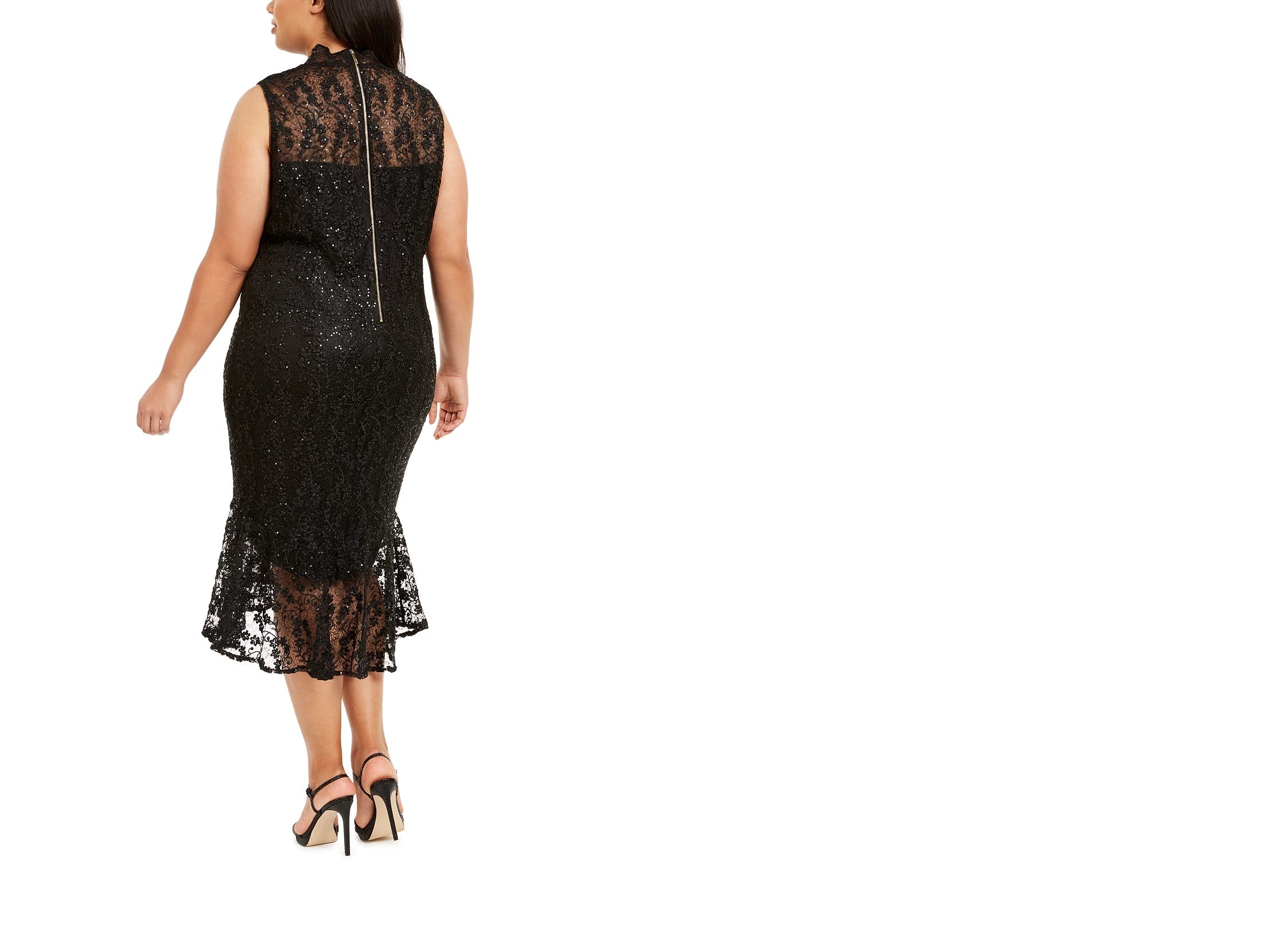 Aproximadamente 50-3/4 de comprimento do centro do pescoço até a bainha | Decote alto; Silhueta midi | Fecho de zíper nas costas | Poliéster | Lavagem a seco