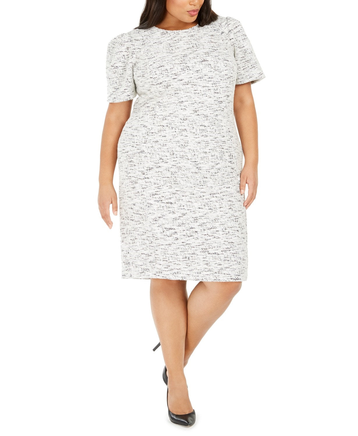 A altura aproximada da modelo é 1,78 m e ela está vestindo tamanho 44W | Comprimento aproximado de 99 cm do centro do pescoço até a bainha, variando 6 mm entre os tamanhos | Decote redondo; Silhueta justa | Zíper exposto no centro das costas | Pregas bufantes nos ombros | Sem forro