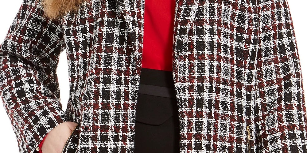 Comprimento aproximado: 34-1/2" | Lapela alta; frente aberta; sem fecho | Ombreiras | Bolsos com zíper nas laterais | Forrado | Poliéster/acrílico/rayon/nylon/lã/algodão; forro: poliéster