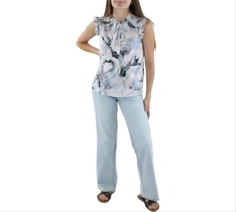 Blusa feminina Calvin Klein estampada com gola amarrada, azul, tamanho pequeno e pequeno