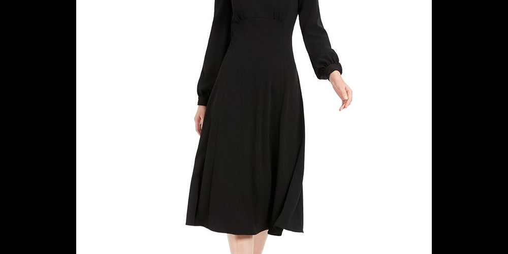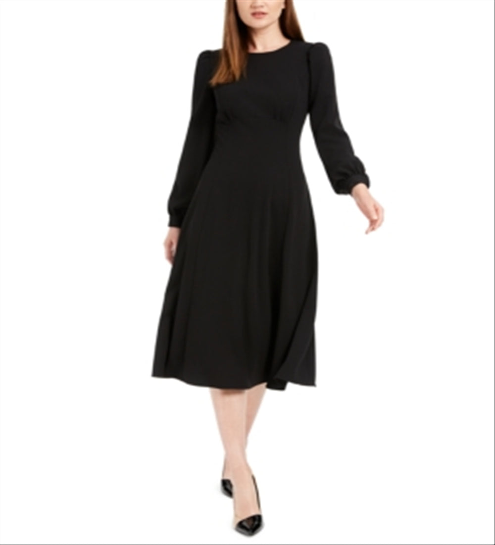 Gola redonda | Zíper traseiro aparente | Mangas bufantes