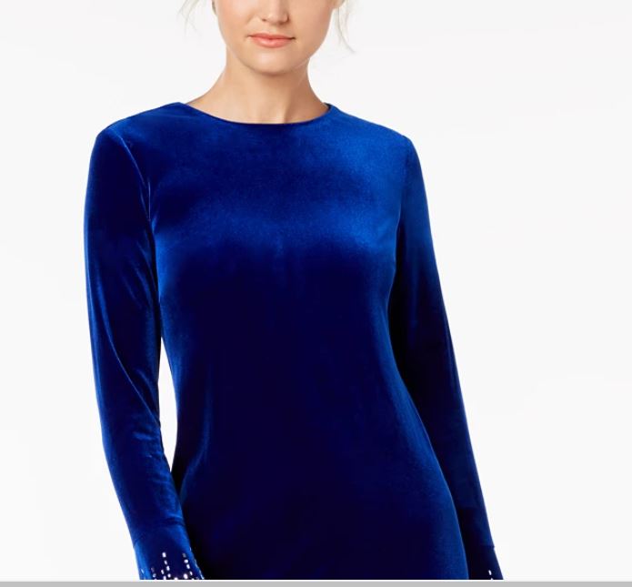 Vestido de coquetel curto Calvin Klein feminino, com strass, zíper, manga sino, gola redonda, azul, tamanho 6, pequeno