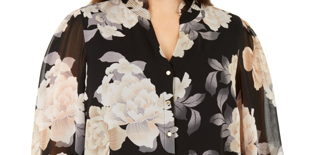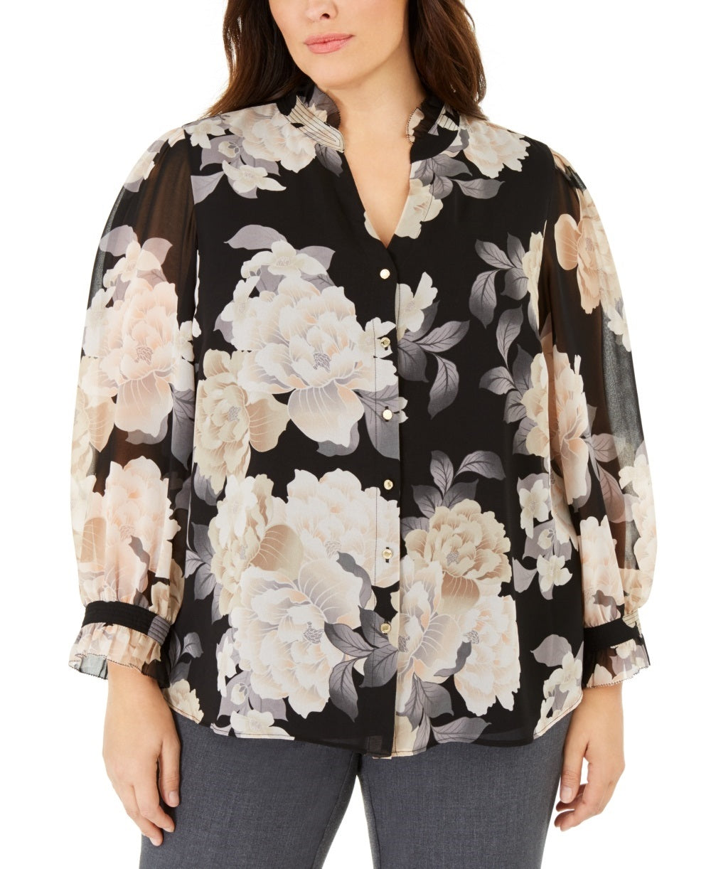 Decote aberto com gola alta com babados e pespontos na parte superior; fecho frontal com botões | Bainha arredondada | Mangas bufantes com punhos abotoados e pespontos na parte superior com acabamento em babados | Exterior: poliéster; forro: poliéster | Lavável à máquina