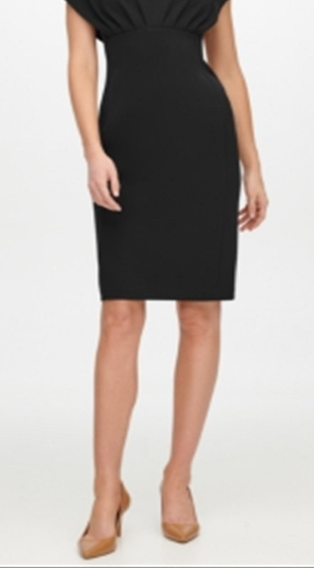 Sofisticado em crepe scuba | O vestido justo da Calvin Klein apresenta cintura império e mangas curtas inspiradas em capeletes