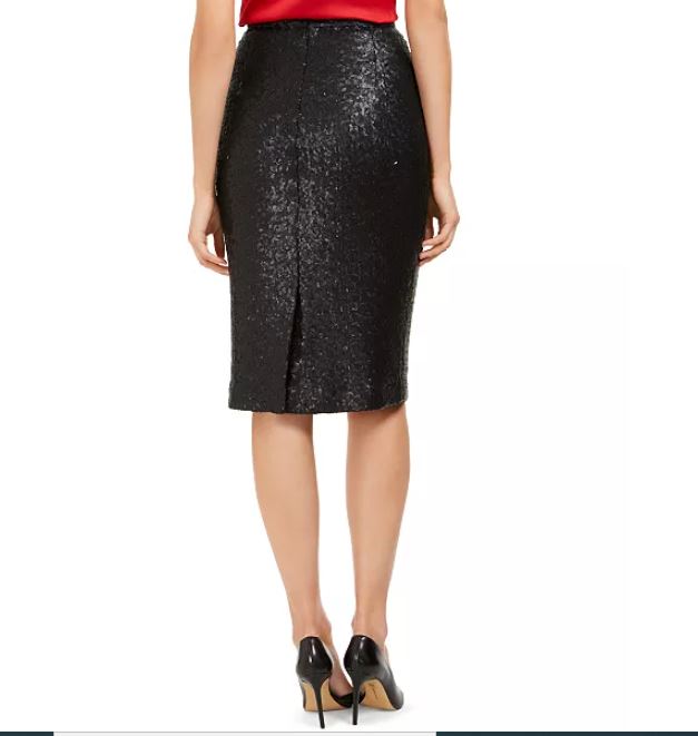 Aprox. 27-1/2" de comprimento; corte lápis | Fecho de zíper oculto nas costas | Lantejoulas por toda parte; fenda nas costas | Forrado | Nylon; forro: poliéster/elastano | Lavagem a seco | Importado