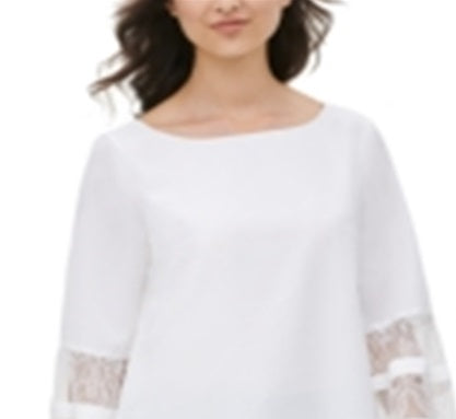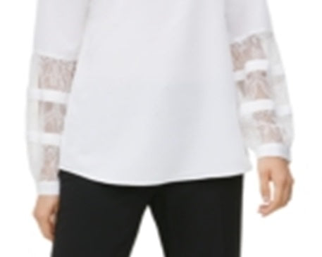 Calvin Klein cria uma silhueta atemporal fabulosa com um trio de inserções de renda nas mangas inferiores deste top chique. O decote canoa garante a máxima sofisticação. | Comprimento aproximado de 25 | Decote canoa; fecho de fechadura e botão nas costas | Inserções de renda na metade inferior das mangas | Exterior; poliéster; combinação; náilon; forro; poliéster | Lavagem a seco | Importado