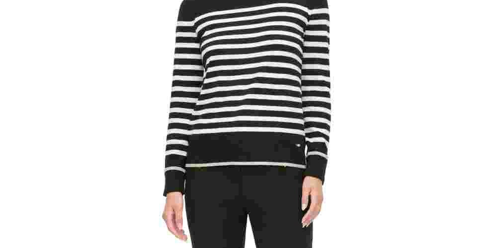 Blusa feminina listrada de manga comprida com decote em joia, preta, tamanho extragrande