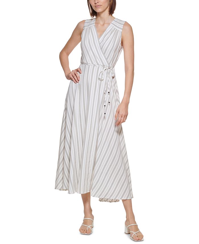 Comemore os momentos doces com este vestido longo e fluido da Calvin Klein, desenhado com listras clássicas por toda parte. | Vestido casual na altura do tornozelo ou mais longo | Decote em V; Silhueta longa | Fecho de zíper nas costas | Amarração na cintura | Forrado | Exterior; poliéster/poliuretano; forro; poliéster