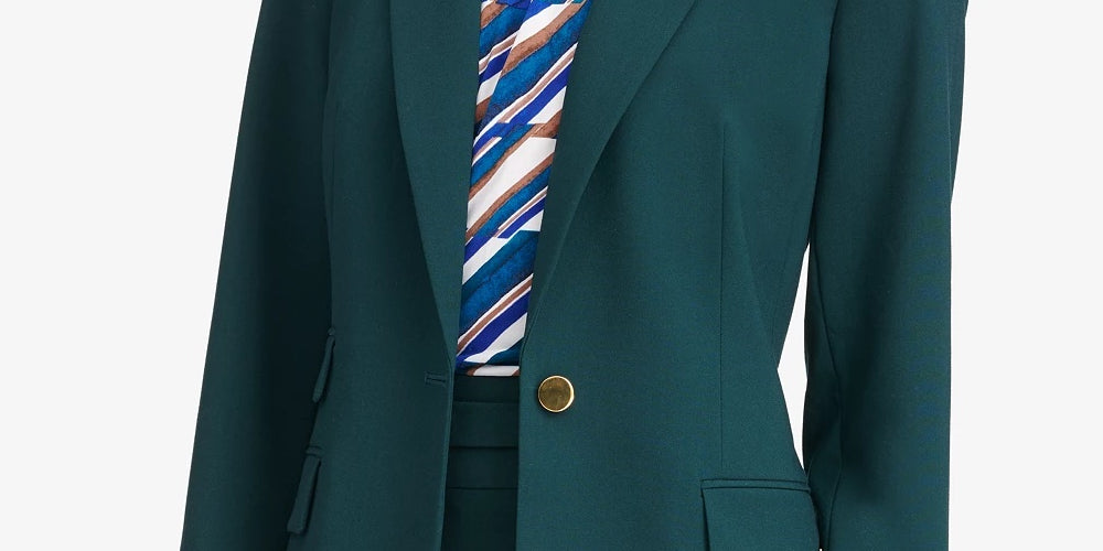 Abaixo do quadril; comprimento aproximado: 32" | Gola entalhada; fecho de um botão na frente | Três bolsos com aba na frente | Forrado | Poliéster/rayon/elastano; forro: poliéster | Lavagem a seco