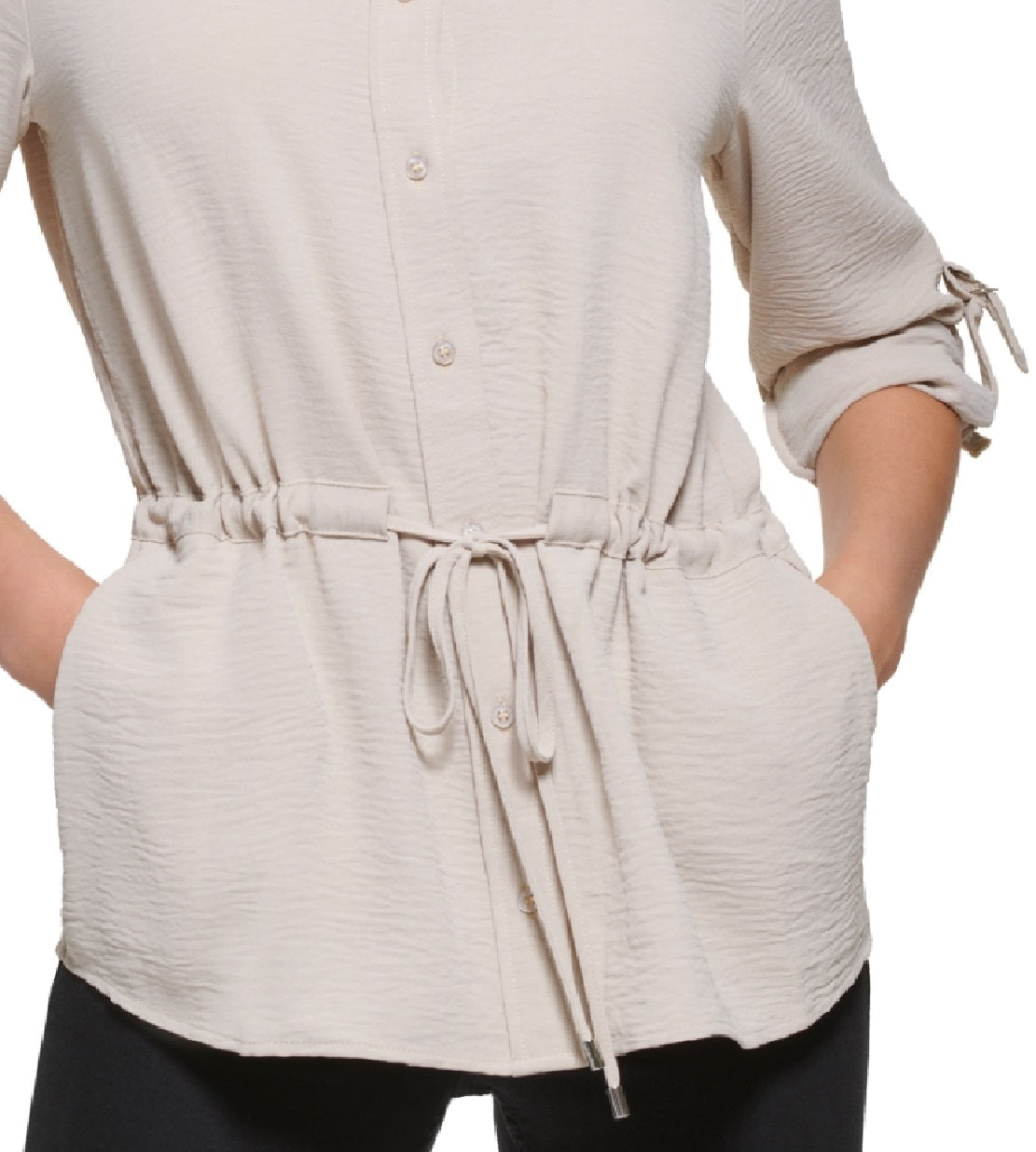 Calvin Klein oferece um top com versatilidade suprema | mangas com abas de enrolar permitem que você ajuste o comprimento, enquanto um cordão oferece um ajuste ajustável a esta camisa de botões. | Aproximadamente 26-1/2 de comprimento | Cordão ajustável na cintura; fechos de botão frontais | Mangas compridas com abas de enrolar | Poliéster | Lavável à máquina