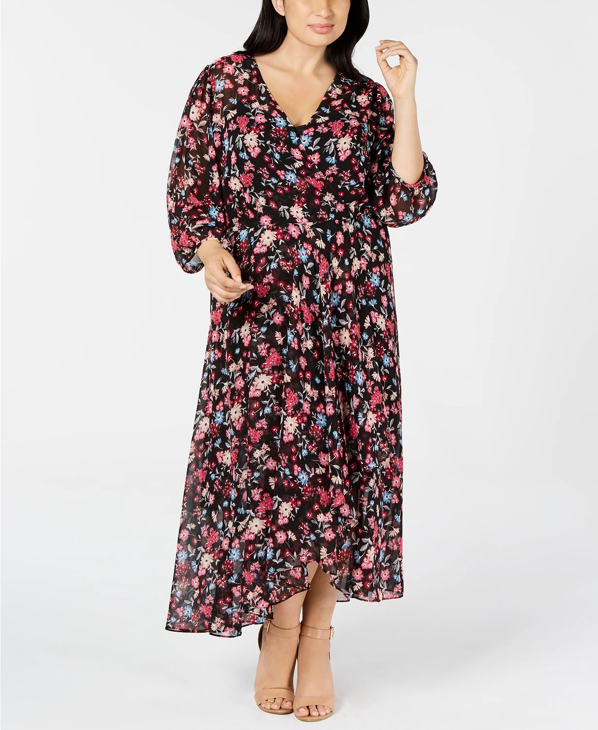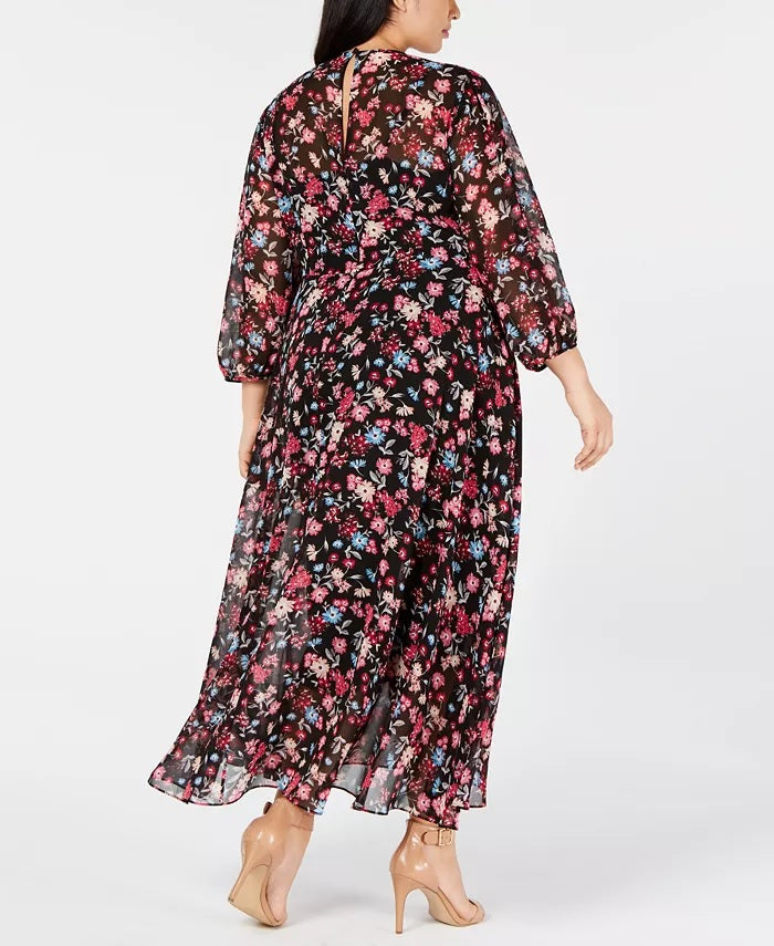 Aproximadamente 13,7 cm de comprimento, do centro do pescoço até a bainha. O comprimento é baseado no tamanho 48W e varia 1/4 entre os tamanhos. | Decote em V; silhueta maxi | Zíper traseiro oculto e fecho de botão tipo fechadura | Mangas 3/4 | Modelagem envelope falso; bainha alta e baixa com babados.