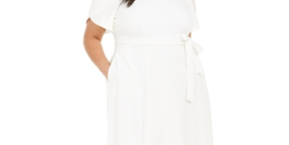 Sólido e chique | este elegante vestido plus size é feito com uma mistura fina de elástico para uma sensação suntuosa | finalizado com gola redonda | mangas curtas tulipa | cinto na cintura e uma silhueta fluida em linha A