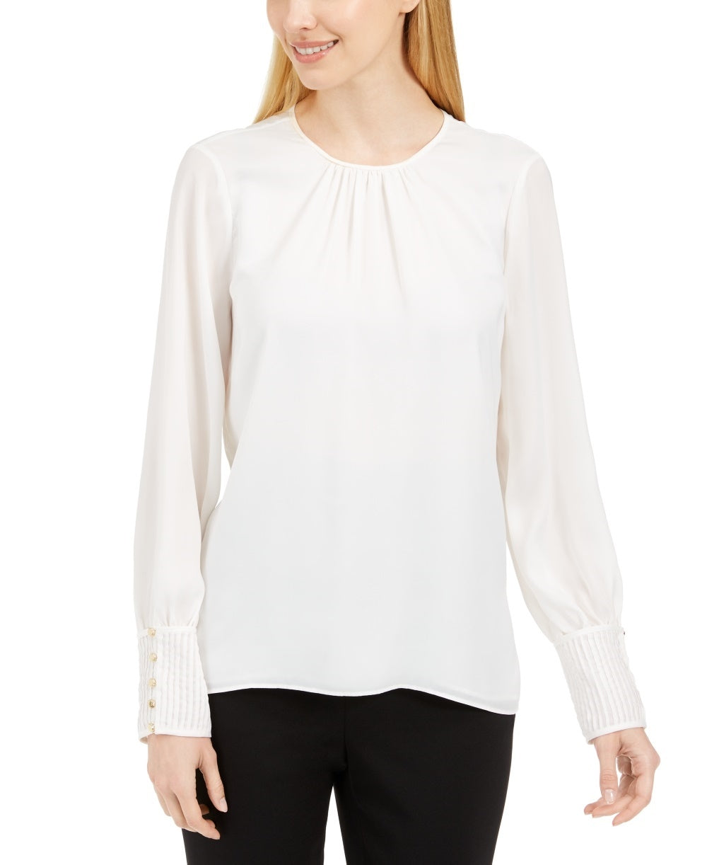 Gola redonda com pregas; abertura nas costas com fecho de botão | Mangas compridas com detalhe franzido no pulso e botões | Poliéster/elastano | Lavagem a seco | Importado