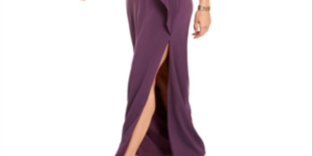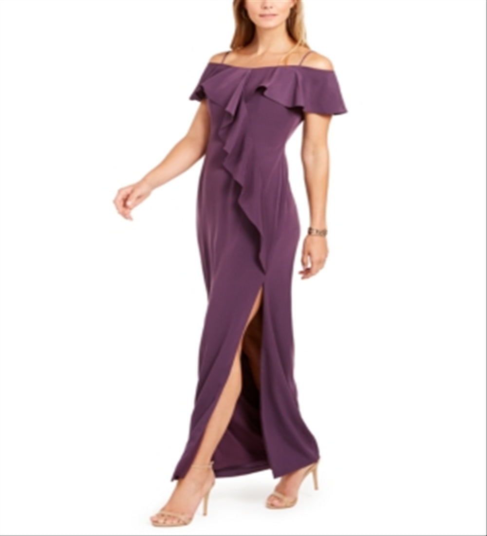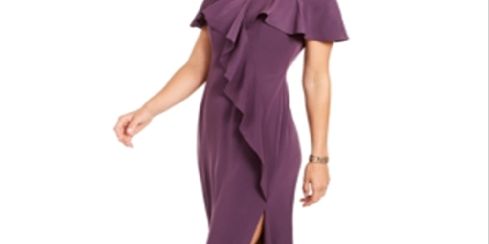 Vestido formal feminino Calvin Klein com zíper, manga sino, ombro de fora, comprimento total, estilo flare, roxo, tamanho 8
