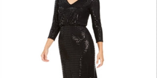 Blusa feminina Calvin Klein com recorte de lantejoulas, manga 3/4, decote em V, comprimento total, vestido formal, preto, tamanho 10