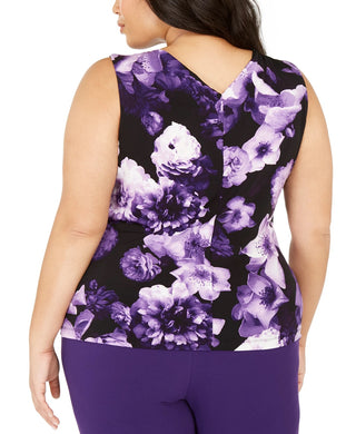 Blusa feminina plus size Calvin Klein, sem mangas, com pregas florais e gola alta, preta, tamanho 1X