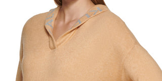 Calvin Klein Suéter Feminino de Malha com Bolsos, Estampa de Logotipo Elástico, Manga Longa, Gola V, Dourado, Tamanho X-G