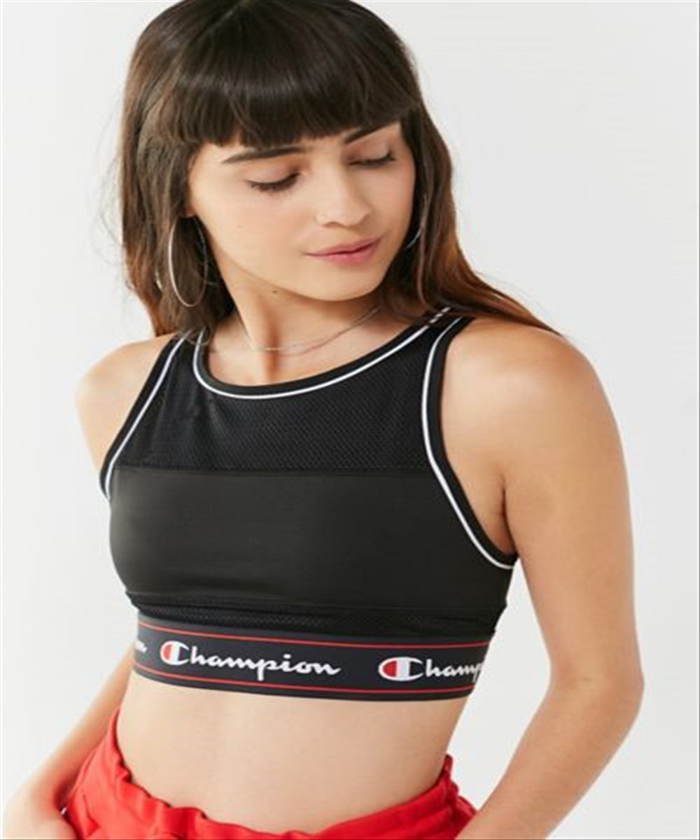 Sutiã esportivo Champion feminino com faixa em malha e suporte médio, preto | Detalhes; |