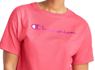 Camiseta curta feminina Champion com logo rosa, tamanho médio