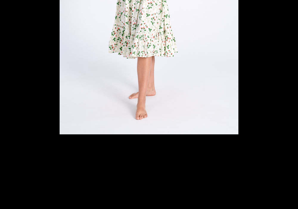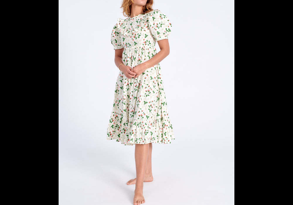 Abrace o charme vintage com o vestido BATSHEVA May | com a icônica estampa Strawberry Field de Laura Ashley | Este vestido midi possui mangas bufantes e uma saia rodada com babados encantadores na bainha inferior | Um babado em V adorna a frente | complementando o prático zíper traseiro para facilitar o uso |