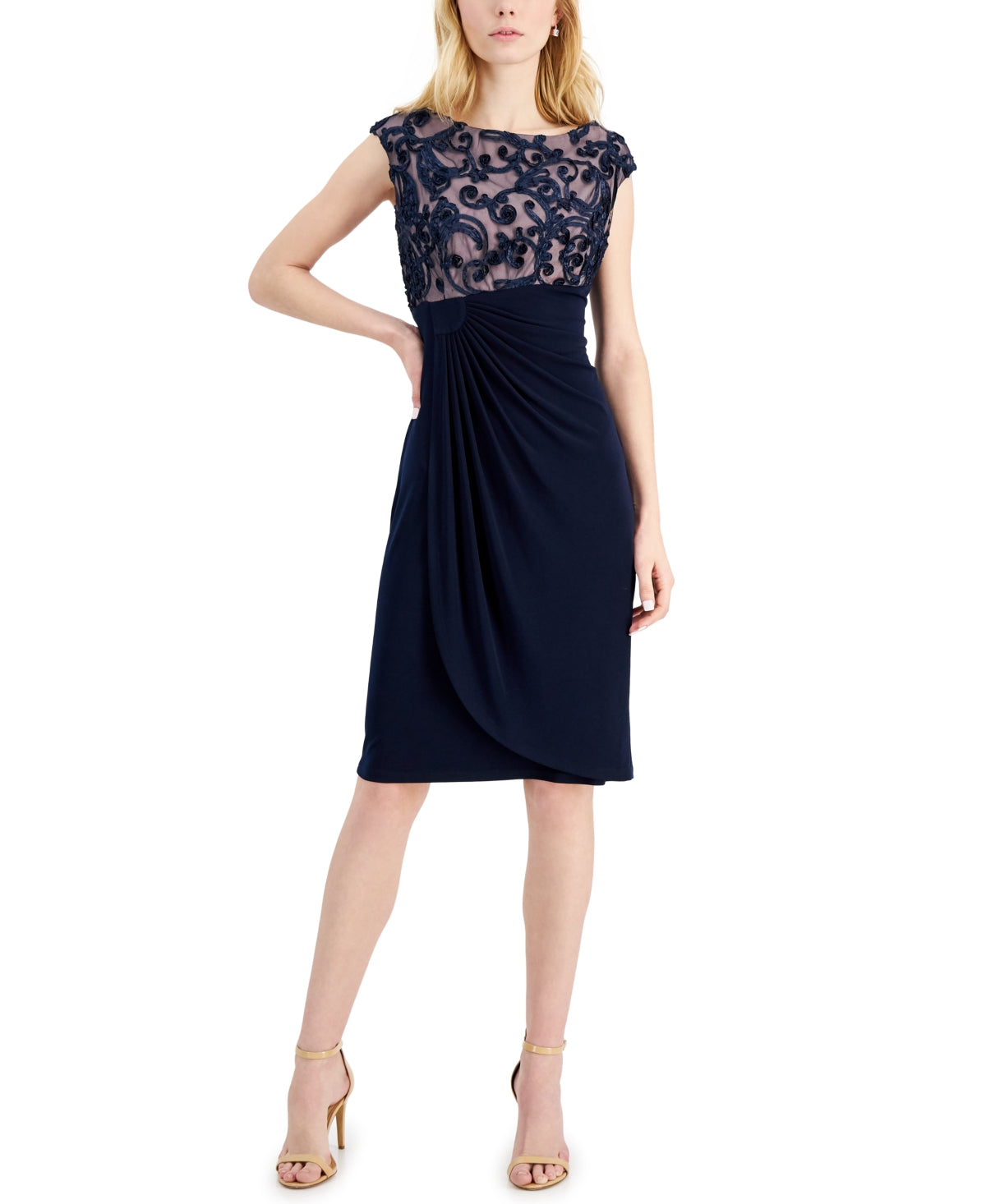 Detalhe intrincado de sutache serpenteia por todo o corpete de malha neste elegante vestido envelope falso da Connected. | Aproximadamente 40 de comprimento, do centro do pescoço até a bainha. O comprimento é baseado no tamanho 6 e varia 1/4 entre os tamanhos | Decote redondo; Silhueta envelope falso | Modelagem pull-on | Detalhe de sutache no corpete de malha; detalhe drapeado na saia; bainha com recorte | NOTA IMPORTANTE: Este item chega com uma etiqueta de devolução anexada e instruções para remoção. Assim que a etiqueta for removida do vestido