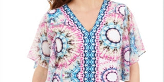 JM Collection Top estampado feminino com tachas, azul, tamanho extragrande