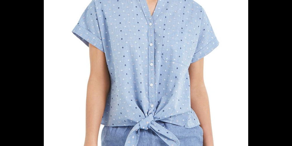 CHARTER CLUB Blusa feminina azul com amarração frontal e bolinhas, manga curta, dividida, com botões, tamanho XS
