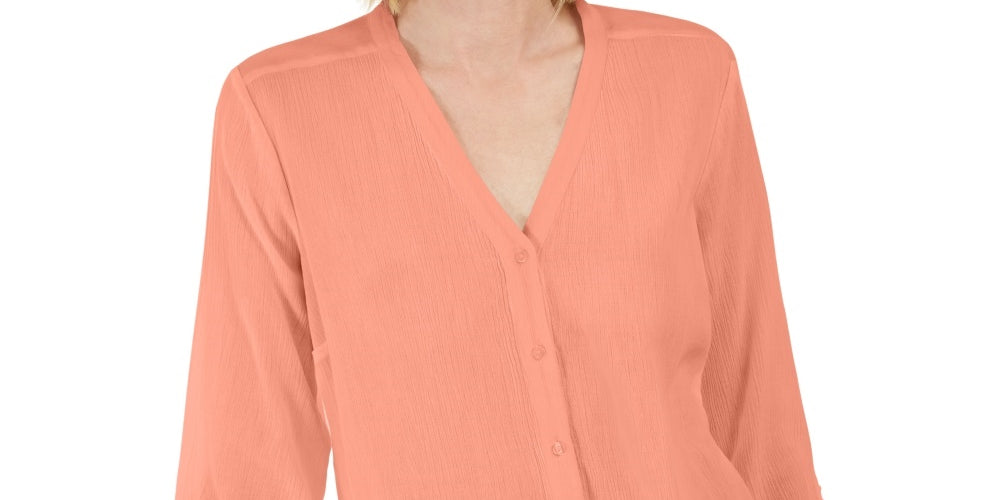 Devido ao tamanho generoso, sugerimos um tamanho menor para um ajuste perfeito | Decote em V; fecho de botão na frente | Mangas 3/4 com laços nos punhos | Algodão/viscose