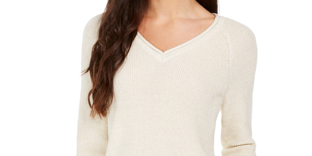 Suéter feminino Charter Club Lurex com decote em V, branco, tamanho médio