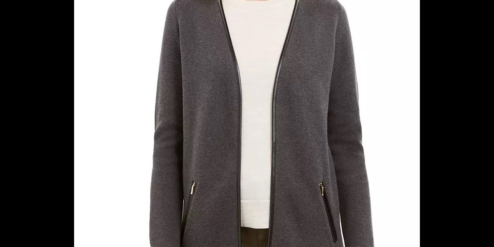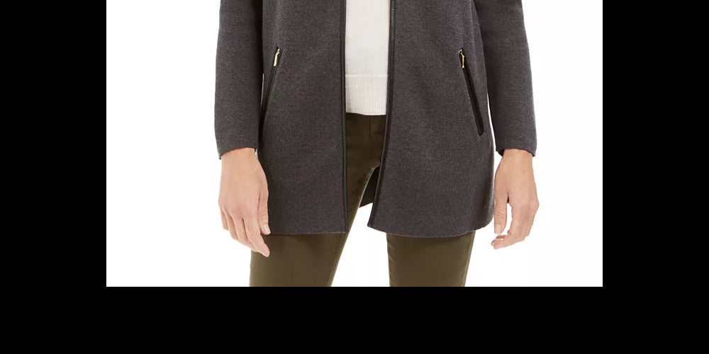 Ajuste relaxado; aprox. 29-1/2 de comprimento | Projetado para se ajustar e valorizar pessoas de 1,62 m ou menos | Frente aberta com acabamento em couro sintético | Bolsos inclinados com zíper e detalhes de debrum em couro sintético na lateral frontal | Exterior; algodão; acabamento; couro sintético; poliuretano