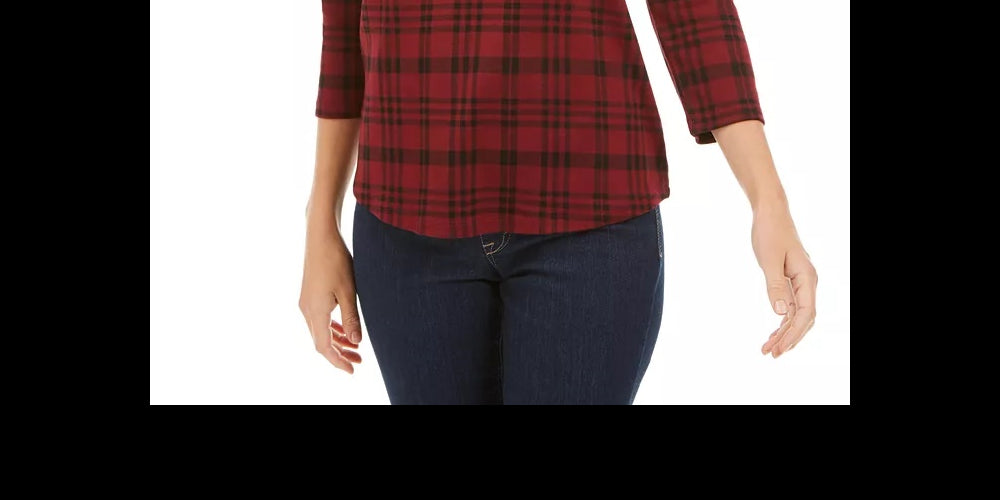 Decote canoa | Detalhes de botões nos ombros | Mangas 3/4 | Acabamento no quadril | Projetado para se ajustar e valorizar pessoas de 1,62 m ou menos