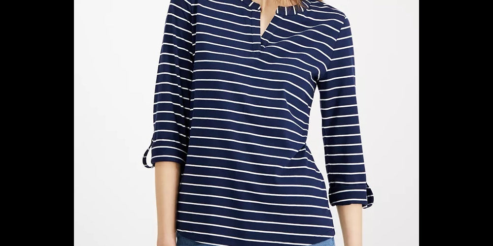 Ajuste no quadril; ajuste relaxado; comprimento aproximado; 25-1/2 | Projetado para se ajustar e valorizar pessoas de 5'4 ou menos | Decote aberto | Mangas 3/4 com abas | Todo em algodão