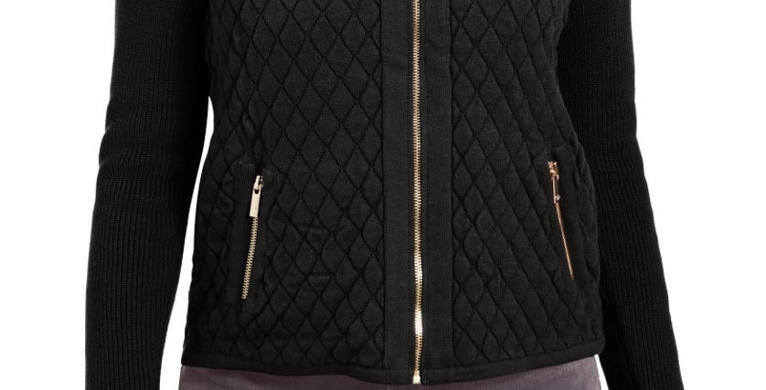 Comprimento aproximado; 21 | Projetado para se ajustar e valorizar pessoas de 1,62 m ou menos | Gola redonda; fecho de zíper frontal | Bolsos com zíper na cintura | Algodão/nylon