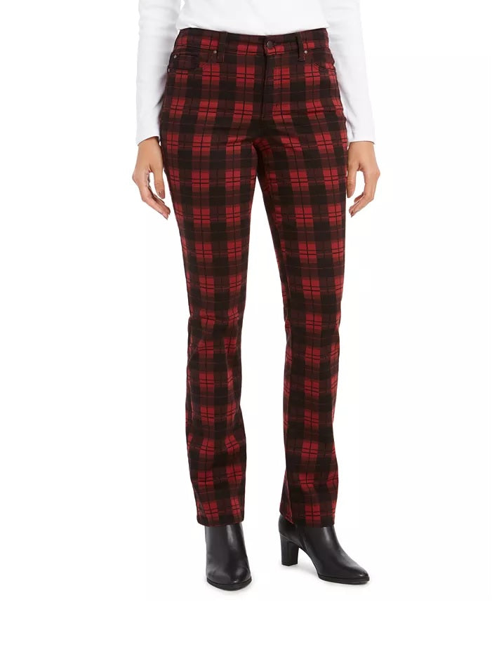 Costura interna aprox.; 28-1/2 | Cós médio | Projetado para se ajustar e valorizar pessoas de 1,62 m ou menos | Painel de controle de barriga | Fecho de zíper e botão; passadores de cinto