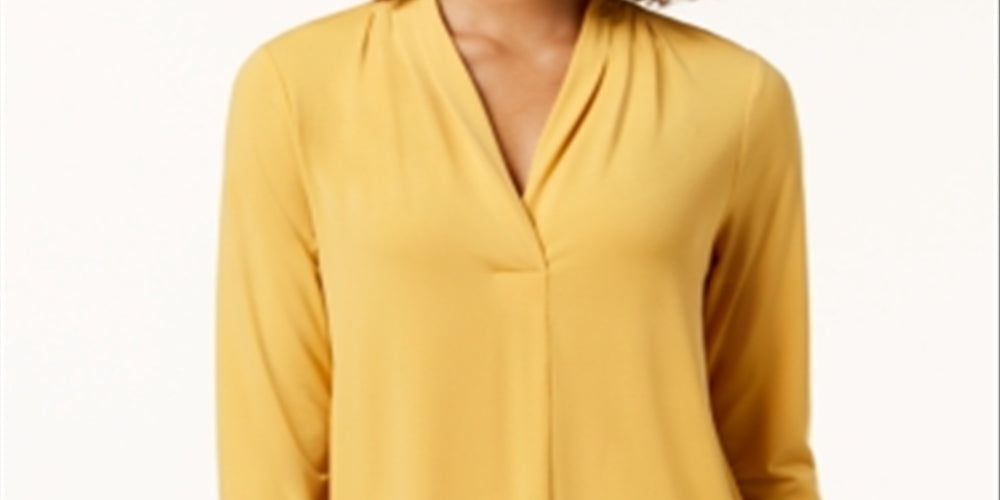 Top feminino Charter Club com decote plissado e manga 3/4, amarelo, tamanho pequeno P