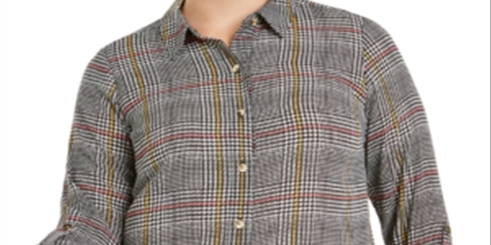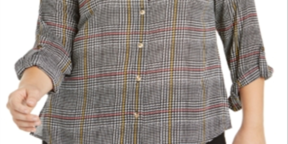 a alfaiataria atemporal desta camisa xadrez plus size do Charter Club é suavizada com georgette trançado drapeado e mangas macias com abas dobradas