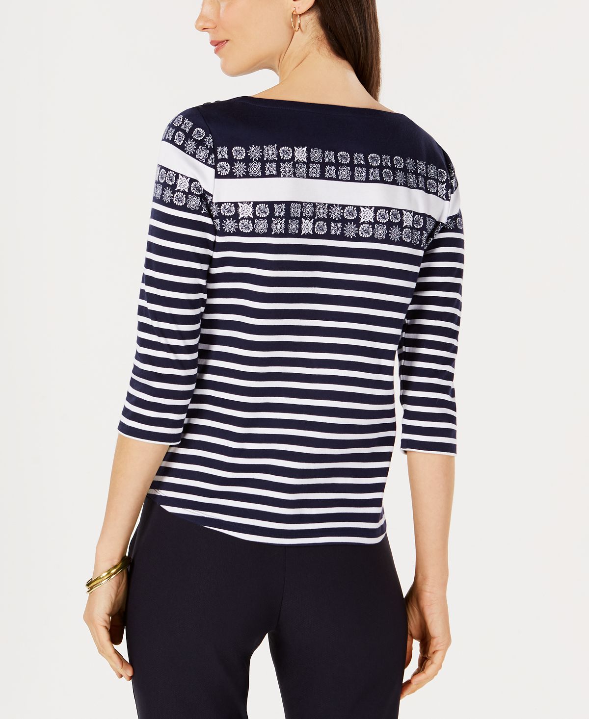 Atualize seus itens essenciais com este top Charter Club de algodão | projetado com um decote canoa clássico | uma mistura chique de estampas e mangas 3/4 para maior cobertura. | Devido ao tamanho generoso | sugerimos um tamanho menor para um ajuste perfeito | Ajustado; atinge o quadril; aprox. 26" de comprimento