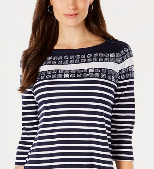 Blusa feminina de algodão estampada com manga 3/4 Charter Club, azul, tamanho M