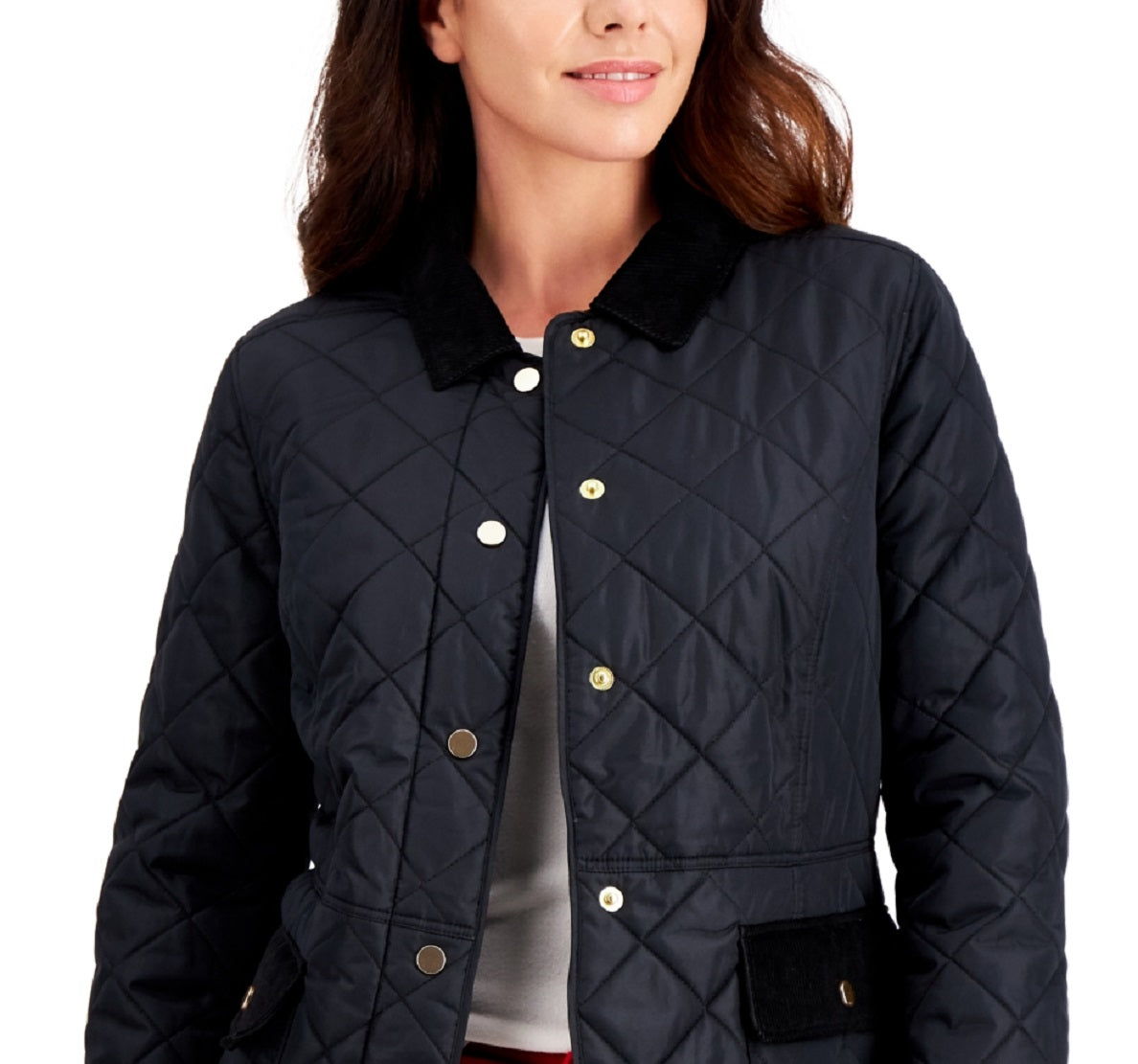 Jaqueta feminina Charter Club acolchoada com acabamento em veludo cotelê, preta, tamanho grande