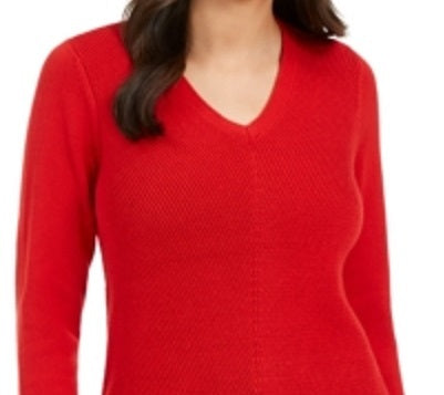 Suéter feminino com nervuras, manga comprida, gola V, vermelho, tamanho pequeno