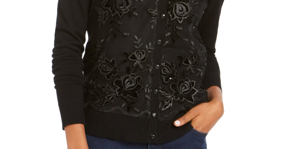 Ajustado; aprox. 23-1/2 de comprimento | Devido ao tamanho generoso; sugerimos um tamanho menor para um ajuste perfeito | Gola redonda; fecho de botão na frente | Lantejoulas; bordado; veludo na frente
