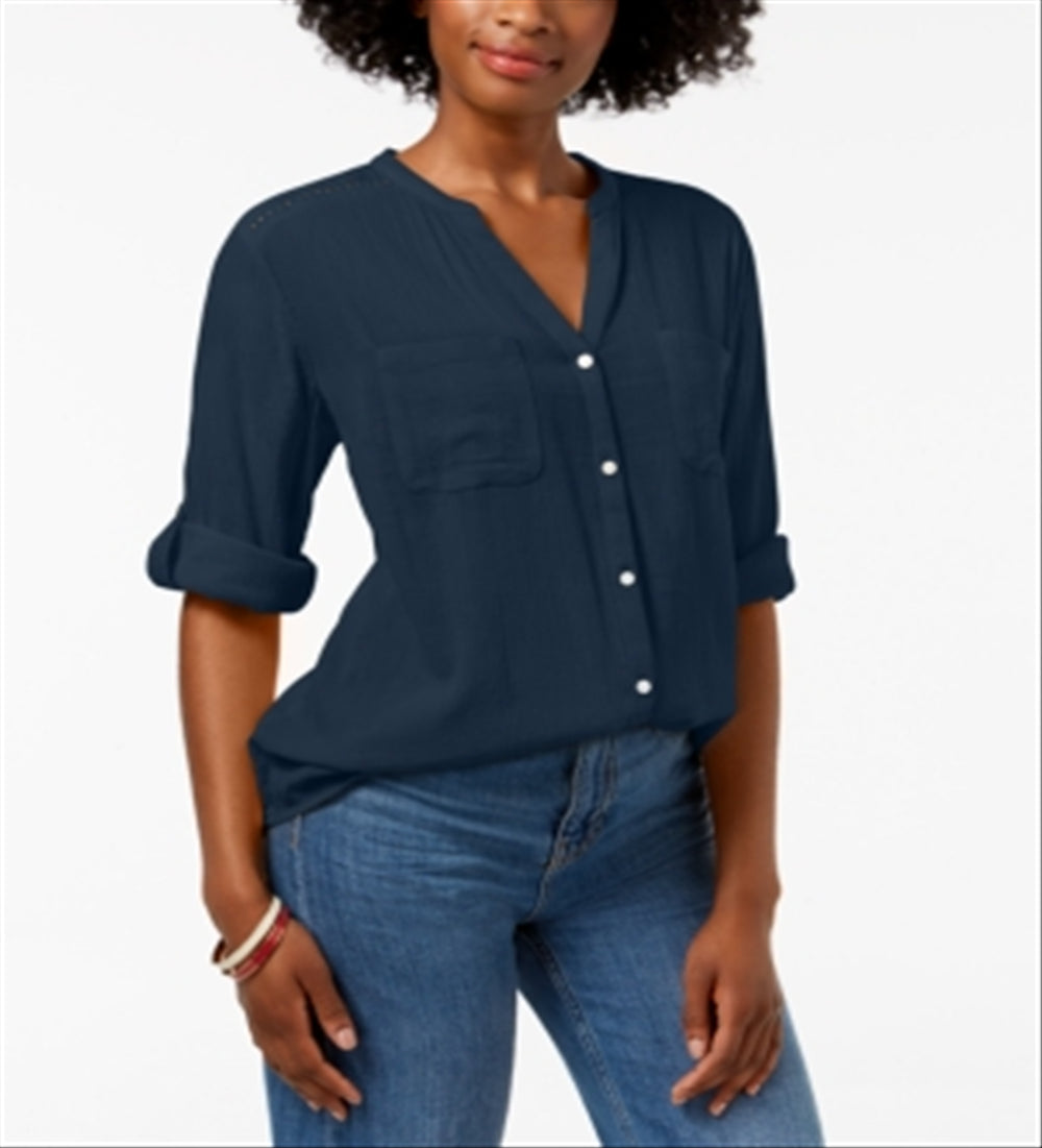 Camisa utilitária feminina Charter Club com decote dividido, azul, pequena e pequena