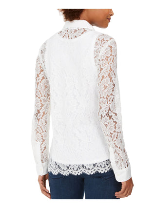Charter Club Blusa feminina de renda, manga comprida, gola alta, botões, branca, tamanho pequeno