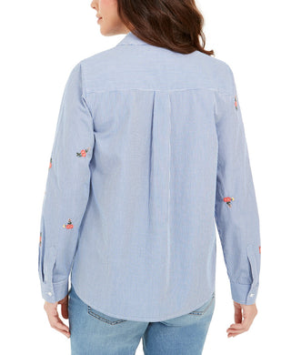 Camisa feminina listrada de algodão bordada Charter Club, azul e branca, tamanho pequeno e médio